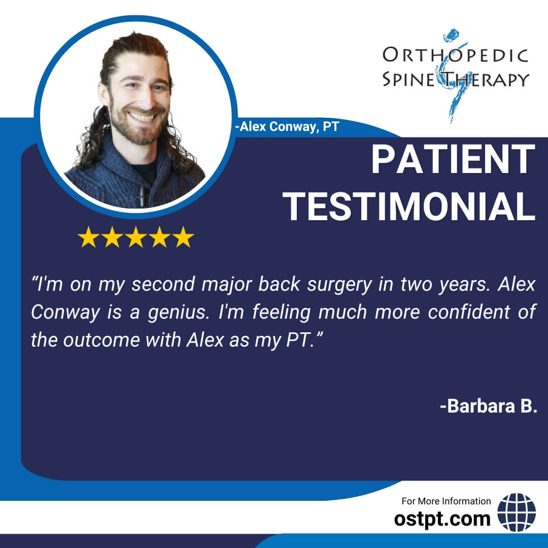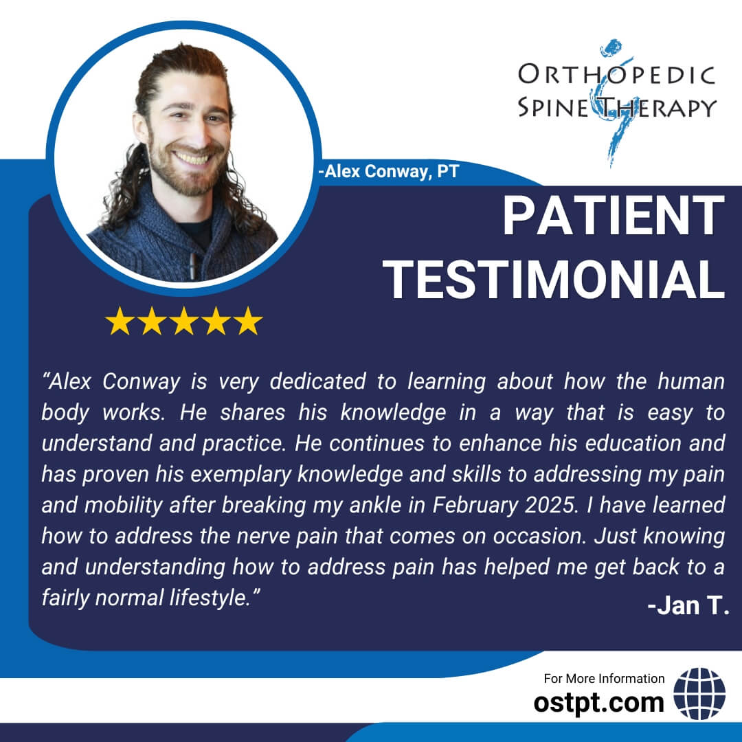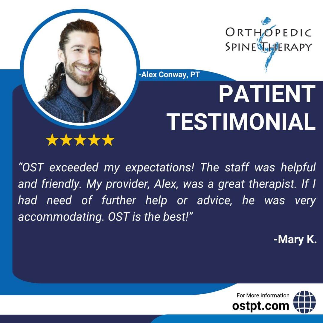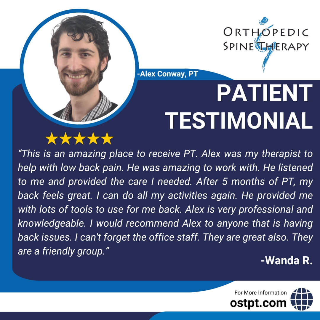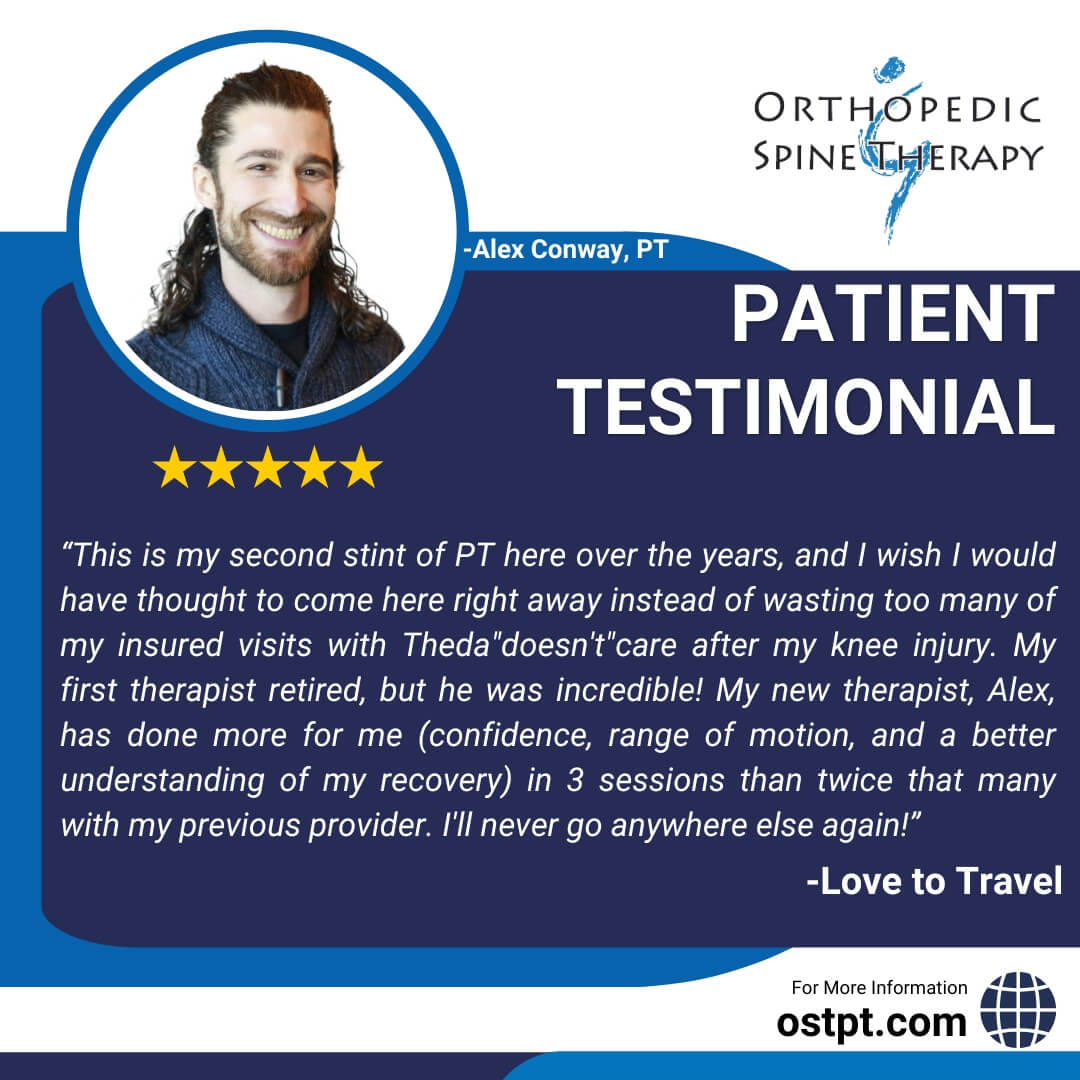 Alex treats a variety of musculoskeletal conditions, but has a passion for treating patients who have had a knee replacement surgery. “I enjoy treating this condition because this is one of the most difficult orthopedic surgeries for patients. Guiding patients through this journey is tough and often faced with many obstacles, but being able to see them achieve their goals is one of the most rewarding parts of my job.” Alex also started a Facebook support group and an online course for rehabilitation from total knee replacements.