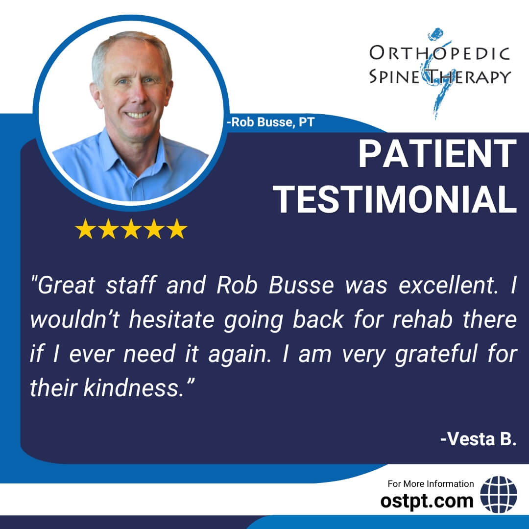 Rob’s favorite part of being a physical therapist is working one-on-one with his patients and getting the opportunity to know each person individually. “I really enjoy the variety of people I get to meet and work with. I focus on being a good listener so I can better understand our patient’s problems and concerns. I look at the patient-therapist relationship as a team. Part of my job is to motivate each patient to get actively involved in their own care.”